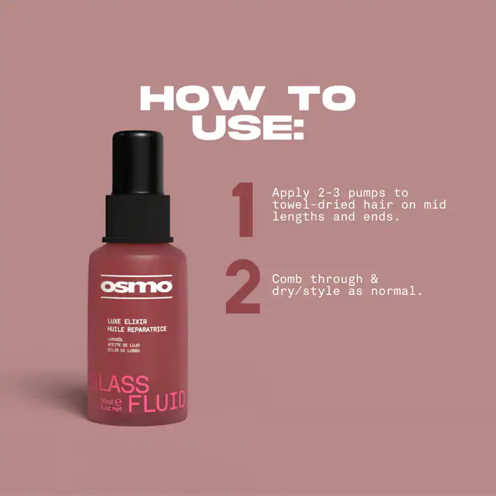 Osmo Glass Fluid Luxe Elixir 50ml is a professional leave-in oil/serum for repair with argan, coconut designed to support a polished finish and easier styling.